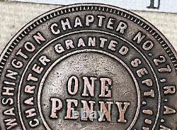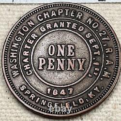 What a fabulous piece of history. Royal Arch Masons, Washington Chapter No. 27, Springfield, KY (Washington County) copper or bronze coin. Charter granted September 1st, 1847.