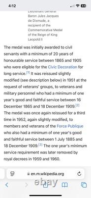 Please review pictures provided for details of condition and please ask any questions before purchasing. About the medal - The medal was initially awarded to civil servants with a minimum of 20 years of honourable service between 1865 and 1905 who were eligible for the Civic Decoration for long service. It was reissued slightly modified (see description below) in 1951 at the request of veterans' groups, to veterans and military personnel who had a minimum of one year's good and faithful service between 16. December 1865 and 18 December 1909.21. The medal was once again reissued for a third time in 1952, again slightly modified, to members and veterans of the Force Publique who also had a minimum of one year's good and faithful service between 1 July 1885 and 18 December 1909.131 The one year's minimum service requirement was later removed by royal decrees in 1959 and 1960.