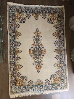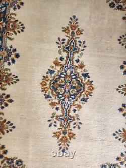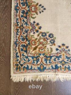 This is a hand-knotted, rectangular Kermani area rug made of wool. It features a medallion pattern in ivory, blue, and multi-colors. The rug has a low pile height and is cut in style.