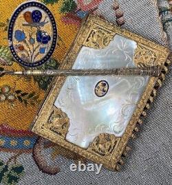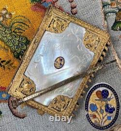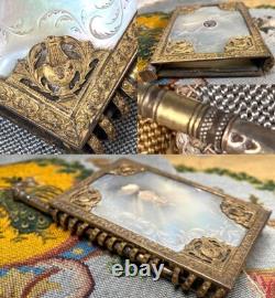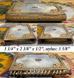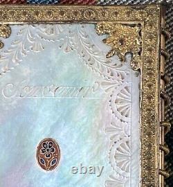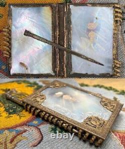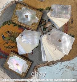 Simple to make a replacement notepad, and this one has a wide spine so you could even make one up to 1/4 in depth to use it as a notepad, or for display. A coveted old beauty in fine mother of pearl, brilliant color pearlescent shimmer and elegant incised engraved design and "Souvenir". The small 18k gold medallion with kiln-fired enamel flower bouquet has a butterfly, as well, and is signature for the finest quality Palais Royal goods from the boutiques of the old Cardinal Richelieu Palace.