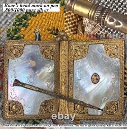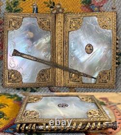 Antique French Palais Royal Aide d'Memoire, Carnet du Bal, Mother of Pearl & 18k. This is my largest one of my collection. Would have had an old original intaglio print calendar inside, dated 1820s, and a note pad of fine paper folded in center. This one no longer has the calendar and note pad.