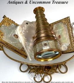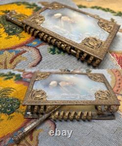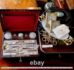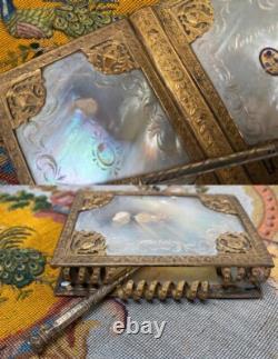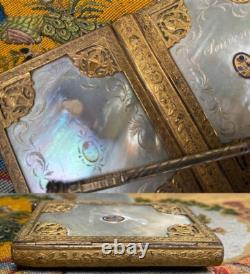 No breaks or losses to the mother of pearl front panel, and no breaks or losses to the ormolu framework - the back panel has an imperfection which has been professionally filled and yet must be noted. It appears there would have been another gold medallion on backside, but it has been lost to time.