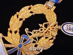 The Order depicts an inscription that stands to "Virtuti et Mérito" (Virtue and Merit,) which is located on the reverse of the crosses, alongside the cipher of Carlos III. The earlier versions of the Grand Cross have an enameled suspension ring featuring the colors of the Order (Blue-White-Blue). The later versions of the Grand Cross have the suspension ring composed of gold or gilt, without any enamel. There are rare examples of the Grand Cross with reversed enamel colors on the central medallion, with a blue background and a white border.
