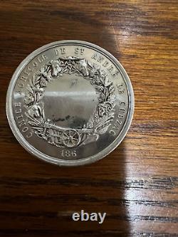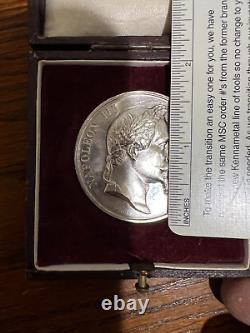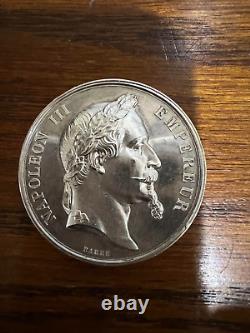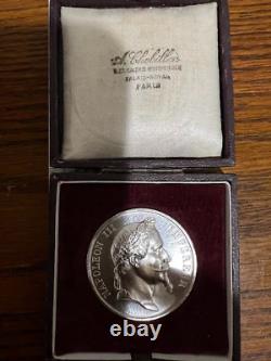 In silver, hallmarked and marked "ARGENT" (silver) on the edge, obverse illustrating the right-facing bust of Emperor Napoleon III, inscribed "NAPOLEON III" at the left and "EMPEREUR" to the right, engraver marked "BARRE" below the bust, reverse illustrating a wreath composed of oak leaves and laurel leaves, along with pine cones and grape bunches, the wreath interspersed with the heads of a horse, a bull, a dog and a ram, with a plough at the base of the wreath, surrounded by the inscription "COMICE AGRICOLE DE ST ANDRÉ DECUBZAC" (Agricultural Board of Saint-André-de-Cubzac) and numbered "186" below the plough, measuring 41.5 mm in diameter, spotting evident on the reverse, very light contact overall, near extremely fine. In its hardshelled case of issue, maroon dimpled exterior, inside lid in white cotton, padded and maker marked A. GALERIE MONTPENSIER PALAIS-ROYAL (Adrien Chobillon), medal bed in maroon felt and recessed, measuring 71 mm (w) x 71 mm (h) x 19 mm (d), exhibiting wear on the paper covering on the bottom, case in worn condition.