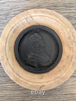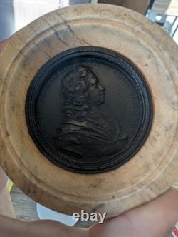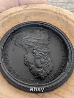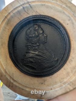 The product is an Imperial Russian Bronze Medallion featuring Peter the Great and the St. Petersburg Seal from the 19th century. This piece has a historical period dating back to Ancient Grecian times, with a composition of bronze.