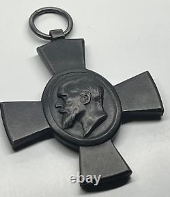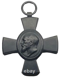 Original WWI German Bavarian Imperial Army Medal King Ludwig Cross 1916. 1916 -1918 - Kingdom of Bavaria King Ludwig Cross. 39 mm wide blackened bronze cross pattée with lateral loop for ribbon suspension; the face with an oval central medallion bearing the head of King Ludwig III facing left from the portrait by Professor Bleeker; the reverse with an oval central medallion bearing the date'7. 1916' imposed on the lozenges of the Bavarian arms; on original ribbon.