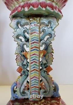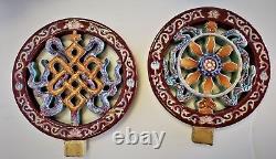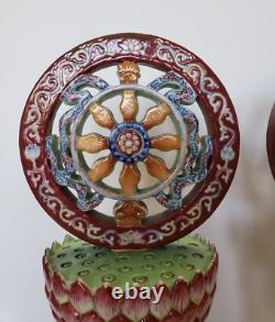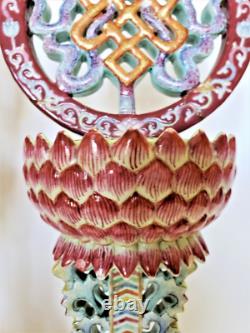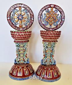 The bright and finely enameled doomed base encircled by a row of lappets rising to a chevron-painted narrow rectangular stem flanked by openwork curled leaves atop a domed embellished base of a five-tiered lotus enclosing a recessed lotus pod base with lotus sprigs above borders of ruyi-heads, pendent lotus lappets and key-fret, the tops of each fitted with a detachable emblem enclosed with a medallion to depict two of the bajixiang symbols, finely detailed and gilt, the underside of the lotus flowerhead and base turquoise enameled, the two emblems being the "dharmachakra" or the Prayer Wheel /Wheel of Law or "falun, " and the Endless Knot or "zhang, " emblematic of love and the ultimate union of wisdom and compassion in enlightenment. Each enclosed within a turquoise ground medallion with foliate scroll, the base glazed turquoise, six-character seal mark of the reign in iron-red and of the period. About the bajixiang or emblem symbology: The Prayer Wheel or the Wheel of Law, "falun, " symbolizes the inexorable expansion of The Buddha's teaching. The Endless Knot, "zhang, " signifies eternity. The Endless Knot, combined with the Prayer Wheel, are symbols of love and the unity of everything.They are symbols of dignity and high rank and the vase connotes not only its function as. For relics but also perpetual harmony and the triumph of birth over death.