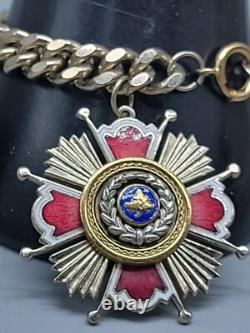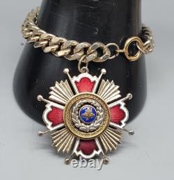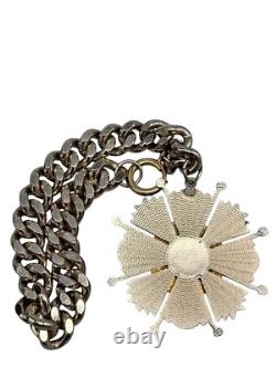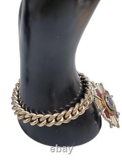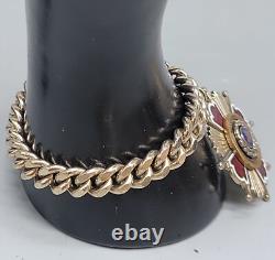 This antique bracelet features a stunning center leaf design adorned with red, white, and blue accents. The 18k ring adds a touch of elegance, making it perfect for any occasion. A unique piece for collectors or fashion enthusiasts.