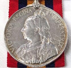 Full sized medal with display court mounted ribbon. Was born in Mold, Flintshire, and attested for the Royal Welsh Fusiliers on 13 August 1885, aged 19. He was promoted Corporal in 1890 and Lance Sergeant in 1892, a rank he held until discharge in July 1902. His intended place of residence on discharge was Vicarage Hill, Rhostyllen, Wrexham.