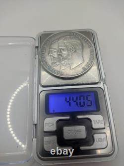Authentic Imperial Russian silver agricultural table medal from 1894 featuring the conjoined busts of Tsar Nicholas II and Tsar Alexander III. Issued by the Department of Agriculture (Zemleustroistva i Zemledeliya), this medal honors agricultural development during the imperial era.