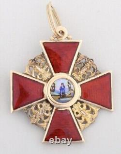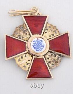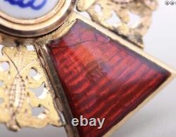 Anna, 2nd Class neck badge in beautiful gold and red guilloché enamel. It displays delicate openwork filigree between the cross arms, a finely painted central medallion, and a clear "AK" hallmark commonly associated with the renowned Keibel workshop of St. With its large suspension loop for neck ribbon and classic design, this piece exemplifies exquisite Imperial craftsmanship.