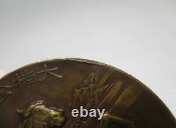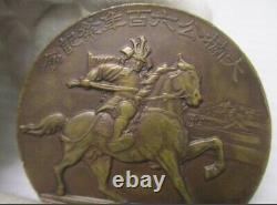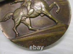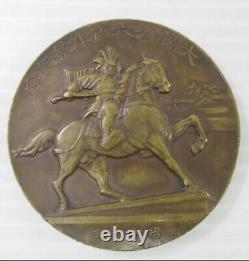 This is a WWII-era Imperial Japanese commemorative medal issued in 1935 (Showa 10) to mark the 600th anniversary of Kusunoki Masashige, a legendary samurai known for his loyalty to Emperor Go-Daigo and his sacrifice at the Battle of Minatogawa (1336). Features a samurai on horseback, wielding a sword. (Dai Nanko 600-nen Sai Kinen). "600th Anniversary of Kusunoki Masashige".